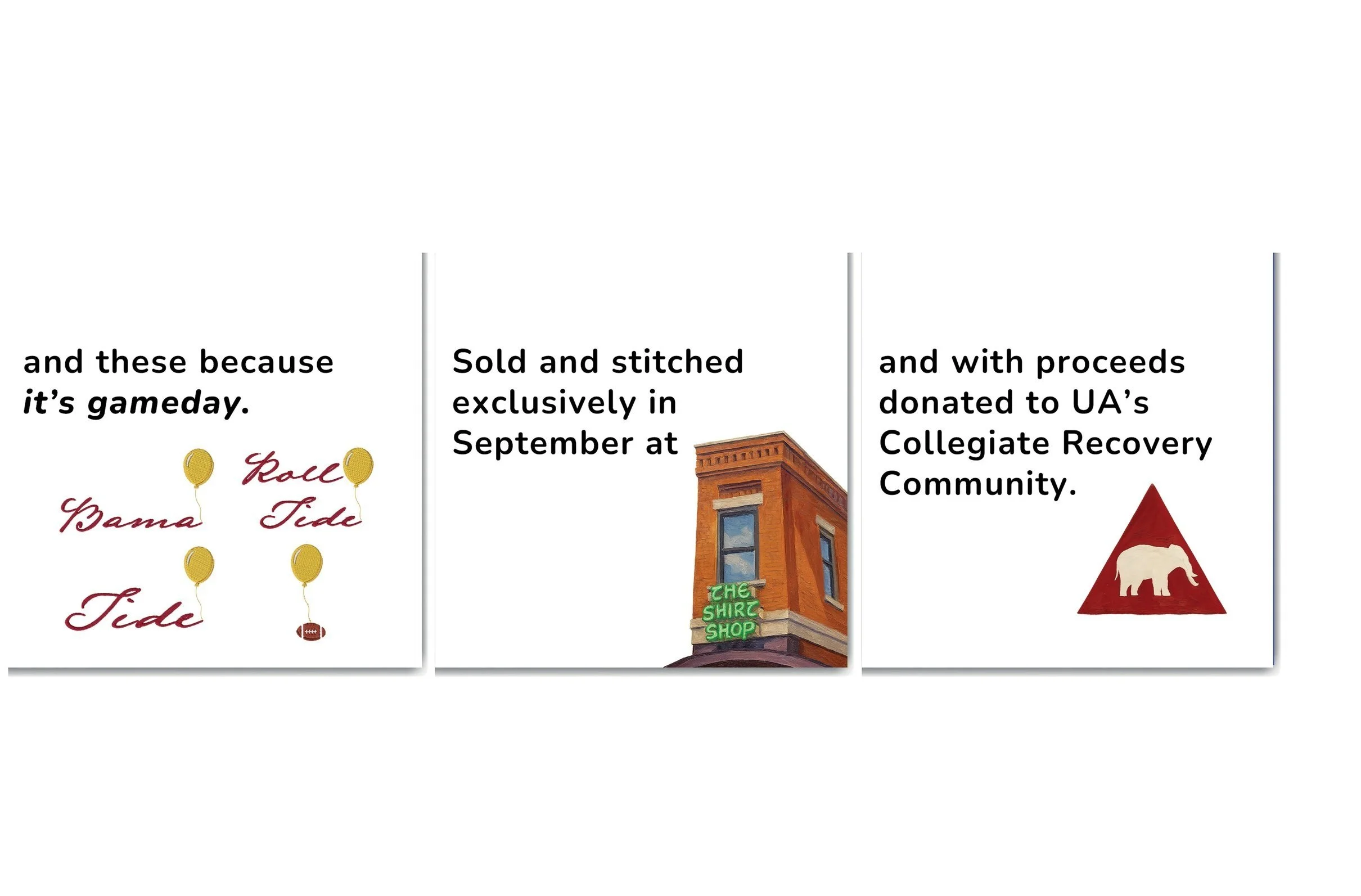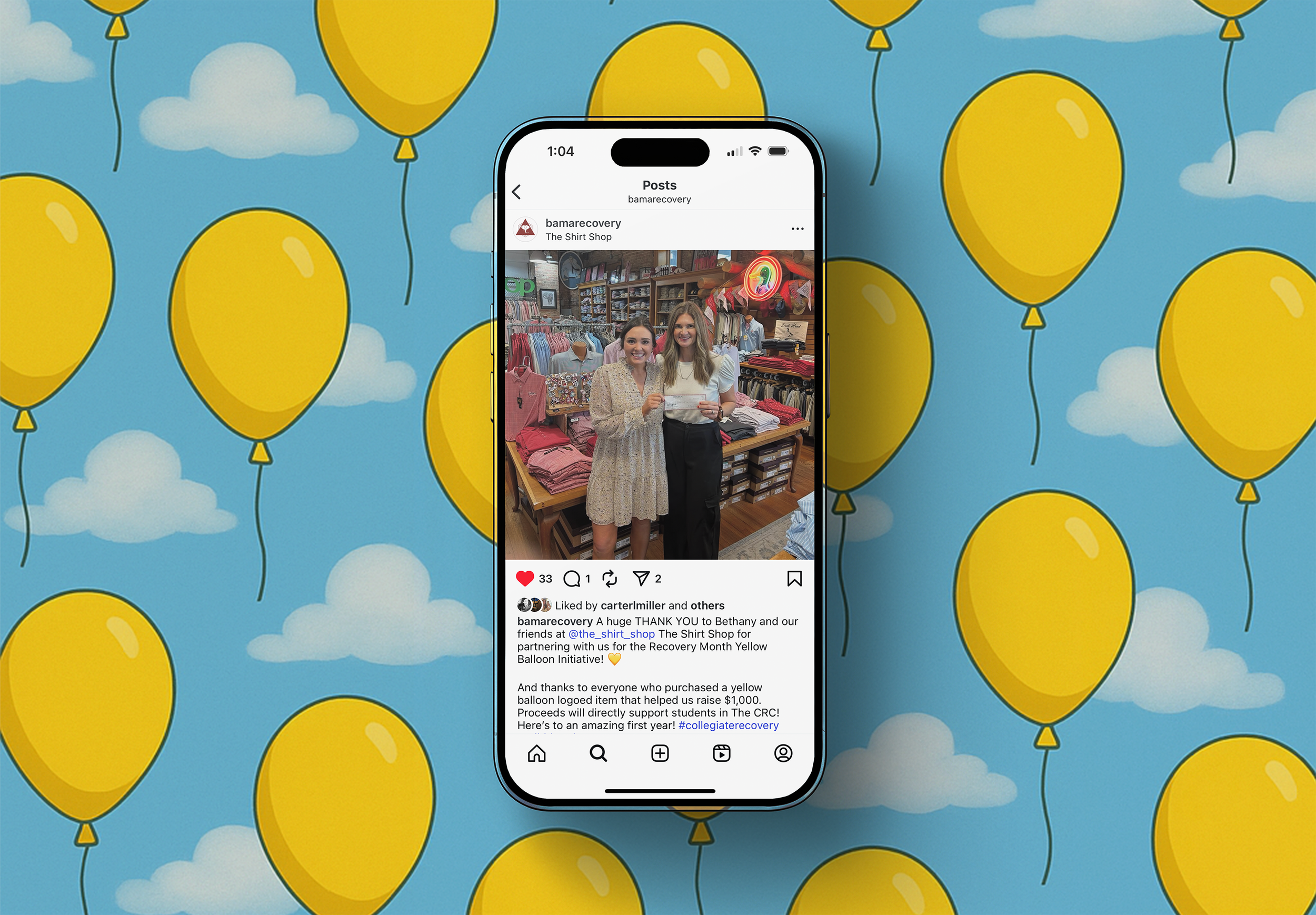 In keeping with the message behind the yellow balloon, the CRC has partnered with The Shirt Shop to raise awareness for recovery in a way that’s visible, tangible, and rooted in Tuscaloosa tradition. Together, we’re releasing a series of patch designs in September—National Recovery Month—to be embroidered on shirts, polos, hats, and other gameday gear. Proceeds from each patch go directly to the CRC’s events fund, supporting tailgates, family dinners, and other community gatherings. At its core, this initiative celebrates one of the CRC’s most powerful purposes: giving students in recovery a chance to belong, connect, and have fun—together.